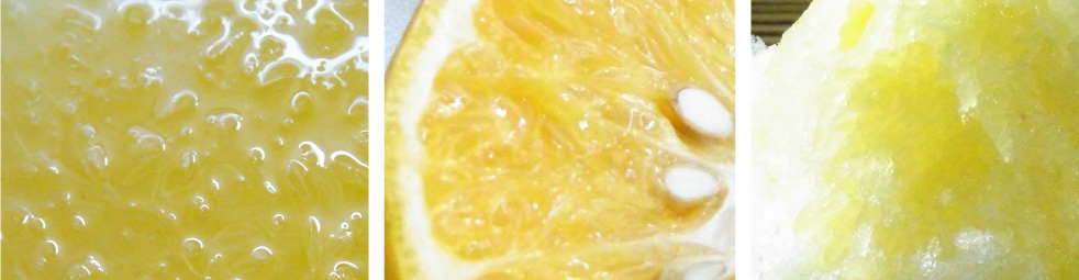 果汁は、砂糖で作ったシロップと合わせました。適度に甘みがありつつも、酸味と少しの苦みが生きています。さらに、表面に散りばめた果肉の粒。食べると口の中に、野性味そのままの夏みかんの果汁が溢れ出します。