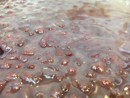 エリモ小豆(この場合には「あずき」ではなく「しょうず」と読みます)を洗い、渋切りをし、ゆっくりと炊いて生餡に仕上げるまでは同じです。その後、「つぶし餡」にするためには、砂糖を加えてゆっくりと豆を潰して練っていくのですが、かき氷用の「粒餡」は、軽く混ぜて加えた砂糖が回ったら、後はゆっくりと冷ましつつ、豆に糖分を含ませて仕上げています。