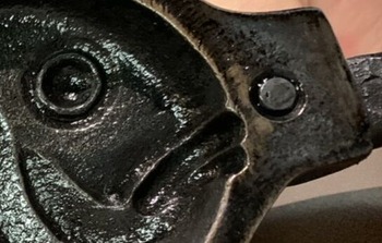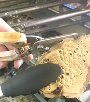 鯛なのにくちばしというのもおかしな話ですが、口先は型を把手に付ける部分があるため、縁が広く、大きなバリができるのです。ただし、この部分のバリは弱く、多くはたいやきを型からはずす時にとれてしまいます。