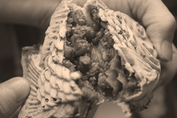 江戸時代の「文字焼」は小麦粉と砂糖または蜜だけを使っていたのに対して、明治時代には造形が工夫され、さらには餡を使うことでバリエーションが増えました。その中のひとつ、「おかしわ」と呼ばれた小麦粉を焼いた生地で餡を巻いたものは、「あんこ巻き」の名称でお好み焼き店などで出されているものとほぼ同じものです。