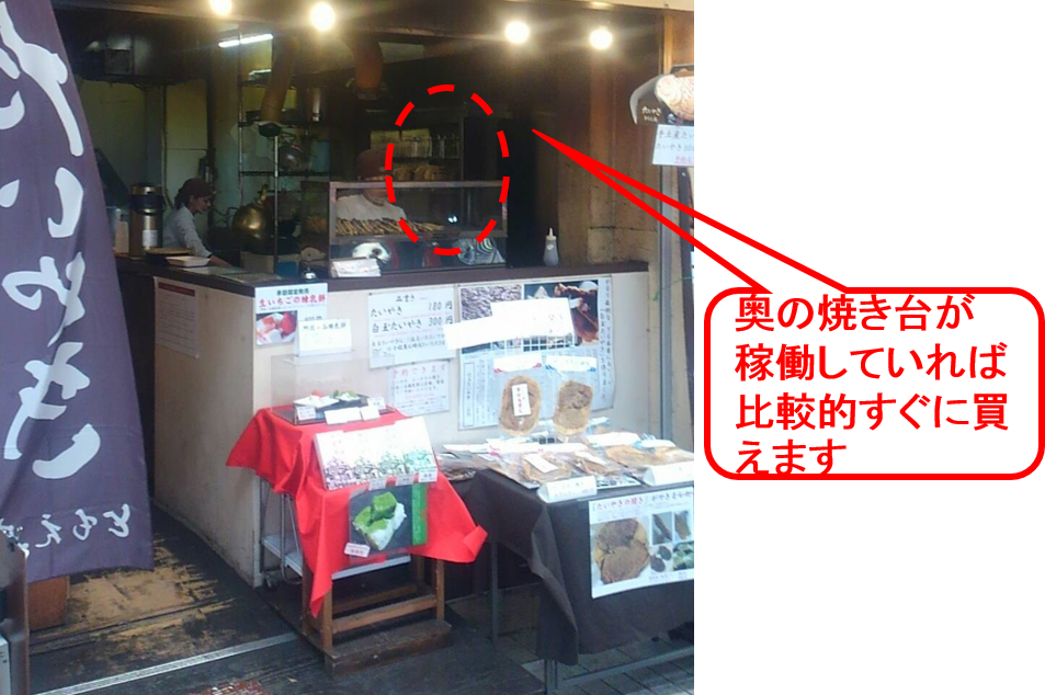 実際に開店から閉店までずっと行列していただければ良いのですが、平日11時、土日10時30分の開店直後や、20時の閉店前はそれほどお客さんが多くありませんので並ぶことなくたいやきをご購入いただけると思います。