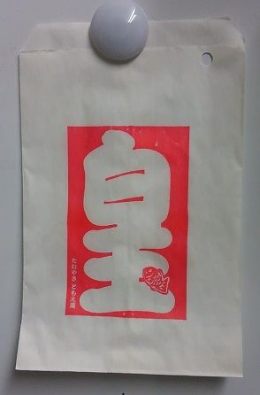 おかげさまで、白玉たいやきが定着したので、新しいたいやきの袋と共通のコンセプトで専用の袋を印刷して使っています。やはり現役で使っている袋ですから、店頭でご確認ください。
