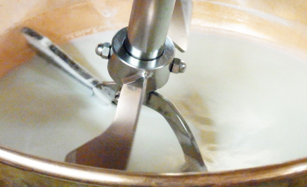 牛乳と砂糖を1時間以上かき混ぜながら煮つめて作った自家製練乳。市販されているものはかき氷には濃すぎるので、かき氷に浸みやすい薄さのものを仕込んでいます。