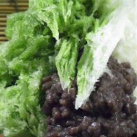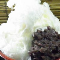 たいやきに使用する餡と同じ小豆から作っており、控えめな甘さも同じです。ひとつ違うのは、たいやきに使うのが、粒を少し潰した「つぶし餡」であるのに対して、かき氷は粒をそのまま生かした「つぶ餡」を使っていること。氷に小豆の色をつけないためです。