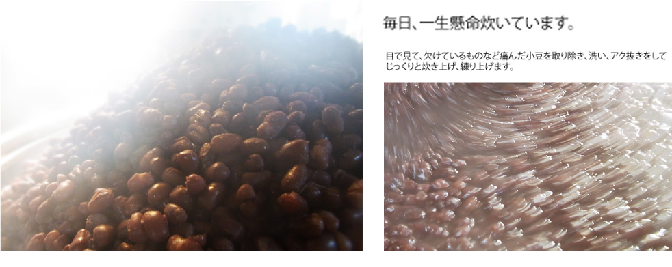 実は、小豆は普通のものを使っています。もちろん国産、北海道の十勝や富良野の小豆です。でも、特別に高級なものではありません。その代わりと言ってはなんですが、毎日、一生懸命炊いています。目で見て、欠けているものなど痛んだ小豆を取り除き、洗い、アク抜きをしてじっくりと炊き上げ、開店前に練り上げます。「閉店が早い」とお叱りいただくこともありますが、朝に練った餡が売切れるまでしか営業できないのです。もちろん、餡が余った場合には廃棄し、もったいないのですが翌日に持ち越すことはしており