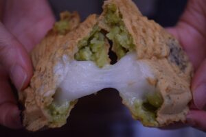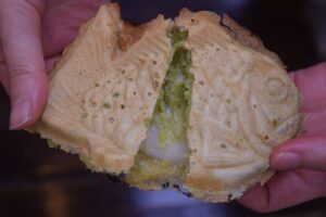 「ずんだ白玉たいやき」を食べると、夏らしい爽やかな味を感じていただけると思います。上に書いたとおり、夏の間しか味わえない枝豆ではなく青大豆で作っているので、本当は夏だけにこだわるものではないのですが、きれいな緑色だからでしょうか、やはり夏を感じます。